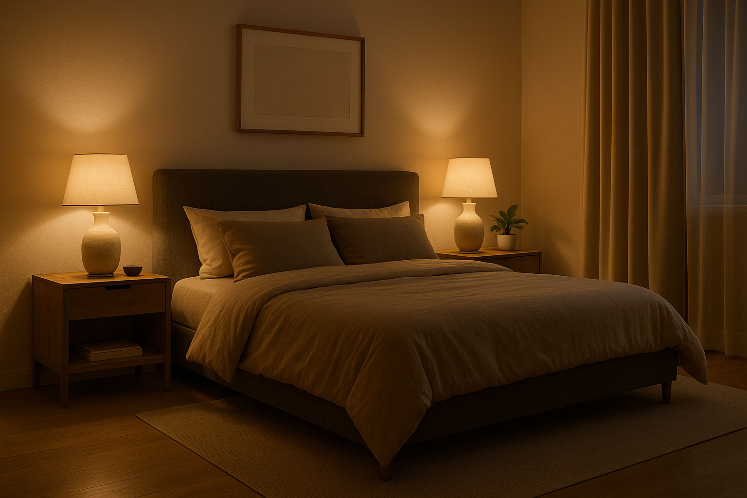 A iluminação certa muda completamente a percepção do espaço. Um quarto com luz fixa e intensa tende a parecer frio e impessoal. Já com iluminação ajustável, o mesmo ambiente ganha textura, profundidade e um clima acolhedor.