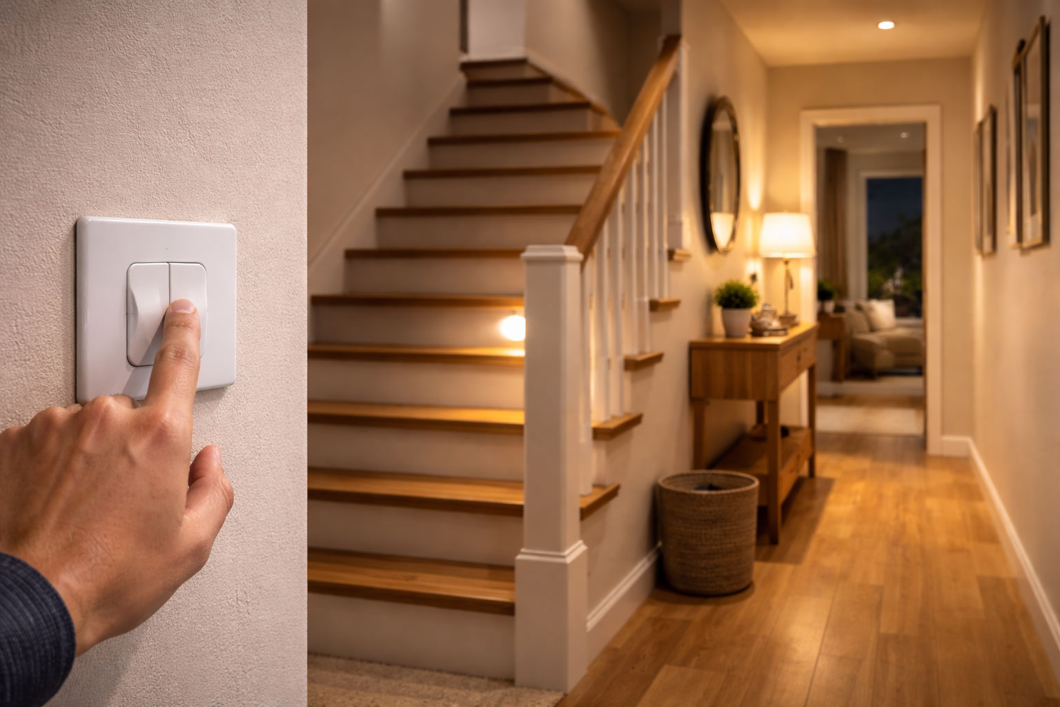 A iluminação de escadas é um dos usos mais comuns do interruptor paralelo. Acender a luz no início e apagá-la no final da escada traz mais segurança, principalmente à noite ou em casas com crianças e idosos.