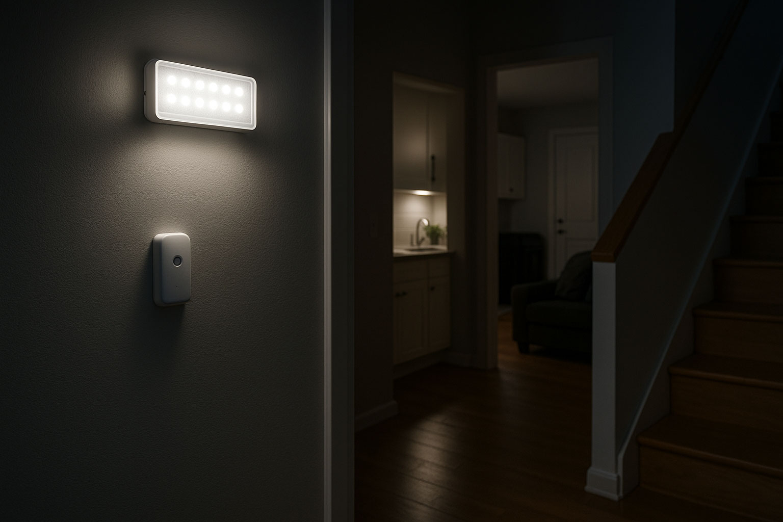 Sensores complementam o sistema de forma inteligente. Em quedas de energia, eles ajudam a acionar automaticamente as luminárias que estejam ligadas ao no-break, garantindo que o morador não precise procurar o interruptor no escuro.