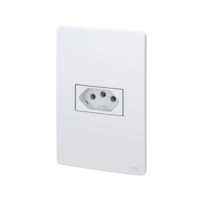 A tomada de 20A no padrão brasileiro 2P+T é indicada para equipamentos que exigem maior capacidade de corrente, garantindo conexão segura e confiável para eletrodomésticos e aparelhos de maior potência. O conjunto acompanha placa e suporte, proporcionando instalação completa, encaixe preciso e acabamento profissional na parede. Fabricado com materiais de alta qualidade e com a confiabilidade da WEG, oferece excelente durabilidade, resistência ao uso diário e instalação prática em caixas padrão.