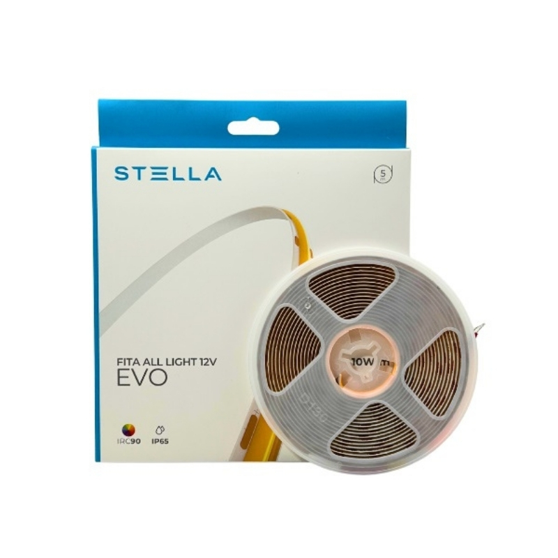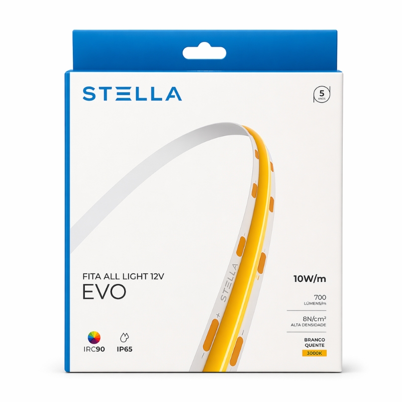 A Fita LED All Light Evo 5m 12V 10W 3000K IRC90 IP65 Stella é uma solução versátil para quem busca iluminação linear com conforto visual, bom acabamento e proteção extra para diferentes aplicações. Com luz quente de 3000K, ela ajuda a criar uma atmosfera mais acolhedora e agradável, sendo ideal para sancas, nichos, painéis, cabeceiras, móveis planejados, prateleiras, espelhos e áreas gourmet, além de ambientes com presença de umidade moderada, graças ao IP65. O IRC90 contribui para uma reprodução de cores mais fiel, valorizando melhor texturas, objetos e detalhes da decoração. Por ser uma fita LED 12V, pode ser dimerizável quando utilizada com fonte dimerizável compatível, permitindo ajustar a intensidade da luz conforme a proposta do ambiente e trazendo mais flexibilidade para projetos residenciais e comerciais internos.