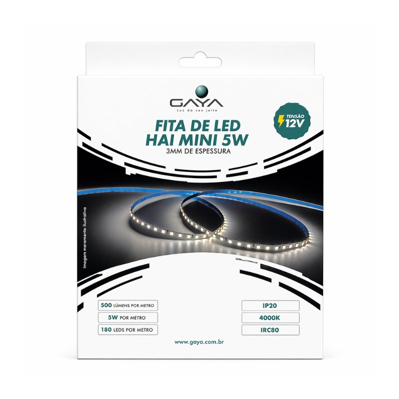 A Fita LED HAI Mini 5W 12V 4000K IRC 80 IP20 Gaya é uma solução prática para quem busca iluminação linear discreta, funcional e com visual limpo em projetos de interiores. Seu perfil compacto favorece aplicações em nichos, prateleiras, móveis planejados, sancas, painéis, cabeceiras e vitrines, ajudando a valorizar detalhes do ambiente com uma luz neutra de 4000K, ideal para quem procura equilíbrio entre conforto visual e boa percepção do espaço. O IRC 80 contribui para uma reprodução de cores adequada no dia a dia, enquanto a alimentação em 12V amplia as possibilidades de uso em projetos decorativos e funcionais. Por ser uma fita LED 12V, pode ser dimerizável quando utilizada com fonte dimerizável compatível, permitindo ajustar a intensidade da luz conforme a proposta do ambiente.