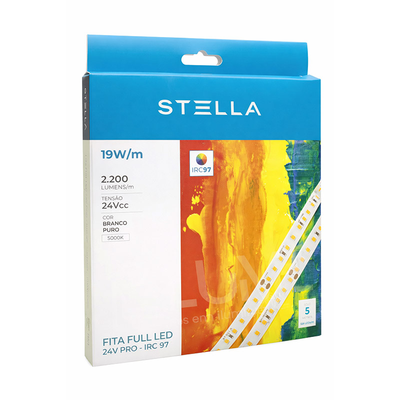 A Fita LED Perfil Full Pro Stella 5m foi desenvolvida para projetos de iluminação técnica e decorativa que exigem alta qualidade e excelente uniformidade de luz. Com temperatura de cor de 5000K, emite uma luz branca neutra que proporciona clareza e conforto visual, ideal para ambientes que precisam de iluminação equilibrada e natural.