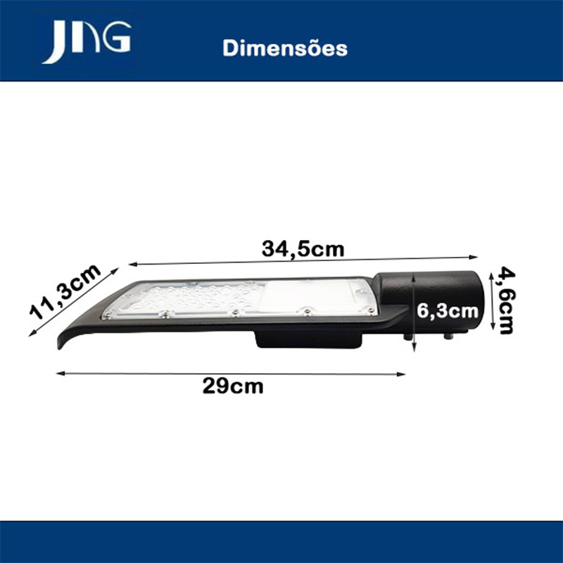 A Luminária Pública LED JNG 30W foi desenvolvida para oferecer iluminação eficiente e econômica em áreas externas que necessitam de boa visibilidade e segurança. Com luz branca fria de 6500K, proporciona sensação de claridade intensa, ajudando a ampliar a percepção do ambiente durante a noite.